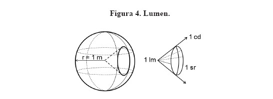 21.  Lumen (lm): Unidad de medida del Flujo luminoso en el Sistema Internacional (SI), que corresponde al Flujo luminoso emitido dentro de una unidad de ángulo sólido (un estereorradián) por una fuente puntual que tiene una Intensidad luminosa uniforme de una candela, según se muestra en la Figura 4. Lumen, que radiométricamente, determina fotométricamente la potencia radiante.