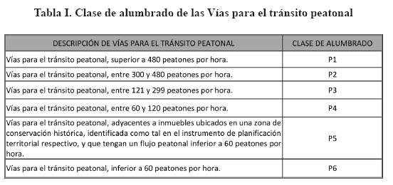a) Vías para el tránsito peatonal: Las respectivas clases de alumbrado se clasifican de P1 a P6, según se establece en la Tabla I. Clase de alumbrado de las Vías para el tránsito peatonal, en función de lo que en ella se indica.