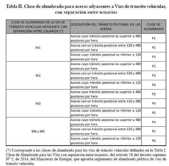 Sin perjuicio de lo anterior, tratándose de aceras adyacentes a vías de tránsito vehicular, con separación entre usuarios, de acuerdo a lo establecido en el decreto supremo Nº 2, de 2014, del Ministerio de Energía, las clases de alumbrado se clasifican de P1 a P6, según se establece en la Tabla II. Clase de alumbrado para aceras adyacentes a Vías de tránsito vehicular, con separación entre usuarios.