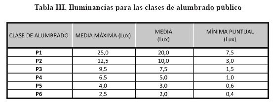 Artículo 20.- Para efectos de determinar las especificaciones de Iluminancia horizontal mantenida exigidas para las distintas clases de alumbrado de las Vías para el tránsito peatonal y aceras, P1 a P6 que debe cumplir el alumbrado público, deberá estarse a la clasificación de los niveles de Iluminancia horizontal mantenida establecidos en la Tabla III. Iluminancias para las clases de alumbrado público.