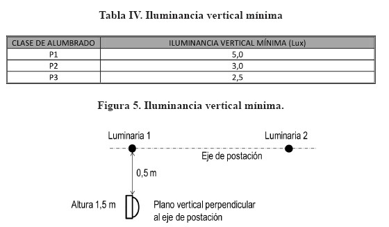 El alumbrado público cuyas luminarias se emplacen longitudinalmente, deberán cumplir con una iluminancia vertical mínima correspondiente al valor obtenido en un plano vertical, perpendicular al eje de postación, a una altura de 1,5 metros y a una distancia de 0,5 metros respecto a la luminaria más próxima sobre la superficie y orientado paralelamente al eje de postación, conforme a lo establecido en la Tabla IV. Iluminancia vertical mínima, según se muestra en la siguiente Figura 5. Iluminancia vertical mínima, valores que deberán ser justificados mediante cálculos fotométricos o programas informáticos de simulación de alumbrado.