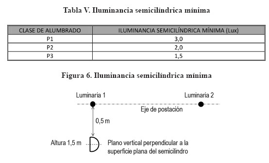 El Alumbrado público cuyas Luminarias se emplacen longitudinalmente deberán cumplir con una Iluminancia semicilíndrica mínima, correspondiente a aquella resultante sobre un semicilindro, cuyo plano vertical perpendicular a la superficie plana sea paralelo al eje de postación, a 1,5 metros de altura sobre la superficie y una distancia de 0,5 metros sobre un eje perpendicular al eje de postación en el punto de ubicación de la luminaria más próxima, establecida en la Tabla V. Iluminancia semicilíndrica mínima, según se muestra en la siguiente Figura 6. Iluminancia semicilíndrica mínima, valores que deberán ser justificados mediante cálculos fotométricos o programas informáticos de simulación de alumbrado.
