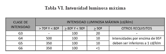 Los valores de intensidad luminosa máxima que deberán cumplir las instalaciones de alumbrado público, se establecen en la Tabla VI. Intensidad luminosa máxima, en que los  ángulos se especifican en cualquier dirección desde la vertical hacia abajo, con la Luminaria instalada para su operación. Tales valores se obtendrán mediante la utilización de los niveles de referencia de Intensidad luminosa máxima de las luminarias.