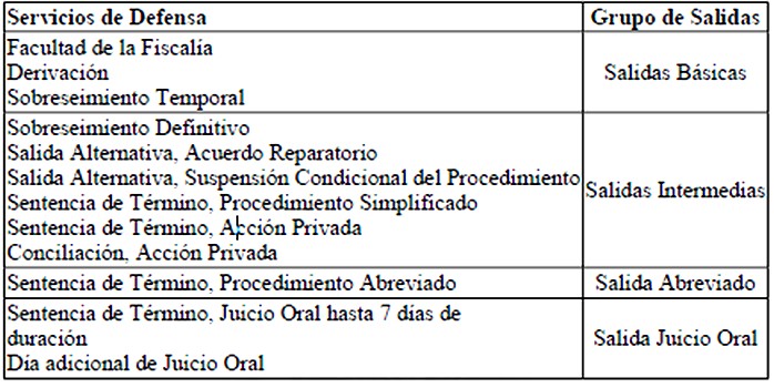 Los servicios antes detallados corresponden a la tipología utilizada por la Defensoría Penal Pública para determinar el tipo de prestación que entrega, singularizándose cada uno de ellos por el nombre de la audiencia en la que se produce el término, debidamente ejecutoriado.".