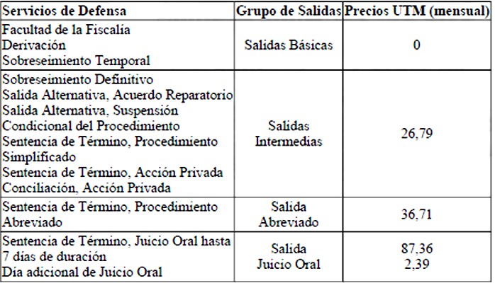 Los valores se encuentran expresados en Unidades Tributarias Mensuales (UTM). El valor de la UTM aplicada a la resolución que fija el monto de los servicios de defensa penal será el correspondiente al mes de la respectiva resolución de cobro.".