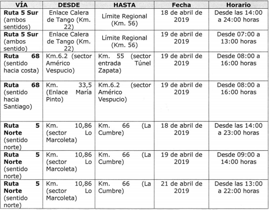 1.- Prohíbase la circulación de vehículos de carga de dos o más ejes en la Ruta Acceso Sur a Santiago, en sentido norte-sur, desde Enlace Vespucio Sur (Km 6) hasta sector Angostura (Km 46) en unión con Ruta 5 Sur, el 18 de abril de 2019, entre las 14:00 y las 24:00 horas y, el 19 de abril de 2019, entre las 07:00 y las 13:00 horas.