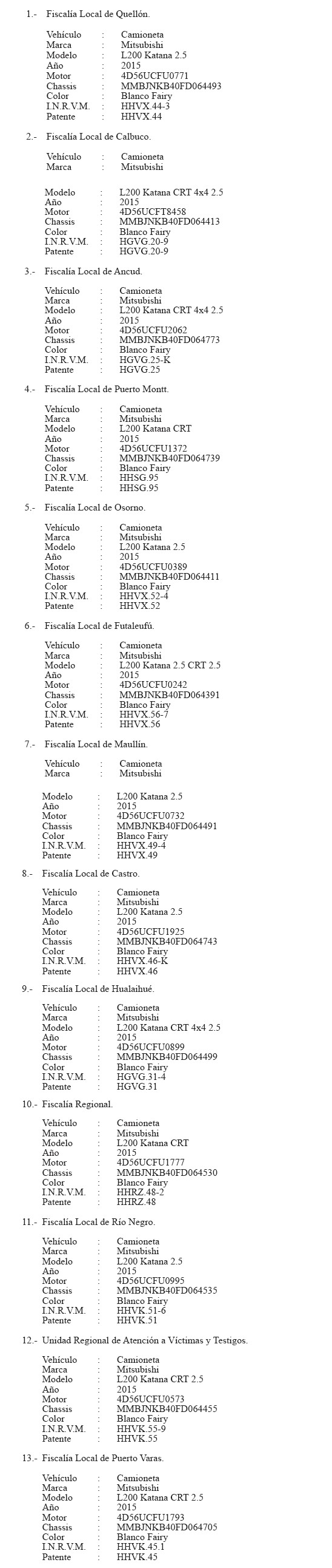 Artículo primero: Autorízase la circulación en horario inhábil y en días sábados en la tarde, domingos y festivos a los vehículos propiedad del Ministerio Público que se individualizan, tomados en arrendamiento para su uso en fiscalías en la Región de Los Lagos: