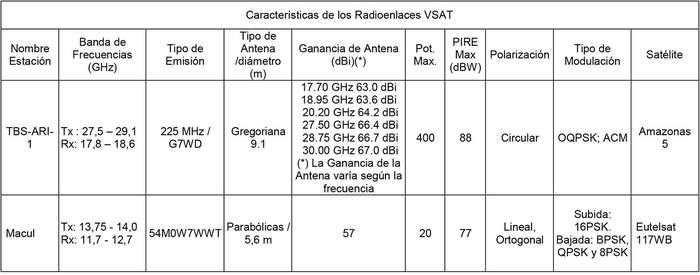 1.4 Para la red de acceso a los EES a implementarse a través de radioenlaces satelitales VSAT de acuerdo al detalle informado en la tabla del numeral primero de este decreto, tales radioenlaces presentan las siguientes características.