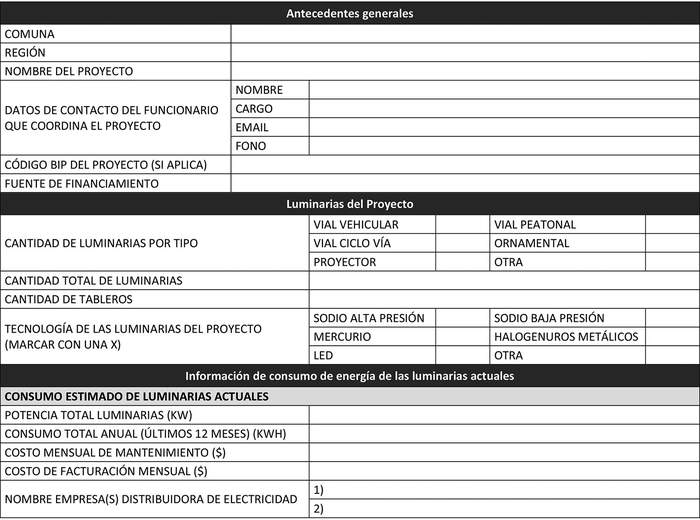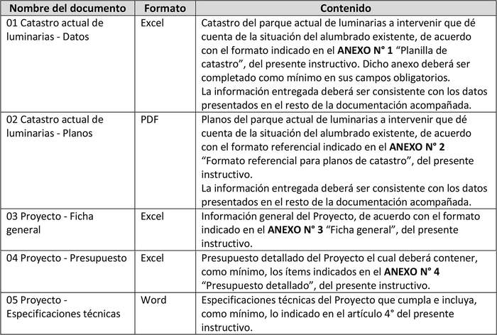 La Entidad Solicitante deberá adjuntar a la solicitud de evaluación técnica de un proyecto de recambio masivo de alumbrado público, los antecedentes, con los contenidos y en los formatos que se indican en la siguiente tabla: