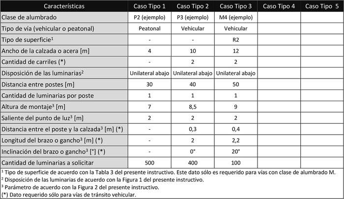 3. Que, se definan los Casos Tipo del Proyecto, necesarios para que las Ofertas al Proyecto evalúen los niveles de iluminación de las vías que poseen una misma clasificación y características geométricas similares. Dichos casos se deberán detallar en la siguiente tabla, de manera similar a los ejemplos Caso Tipo 1, 2 y 3 presentados.