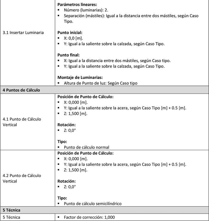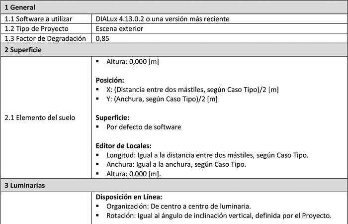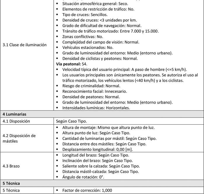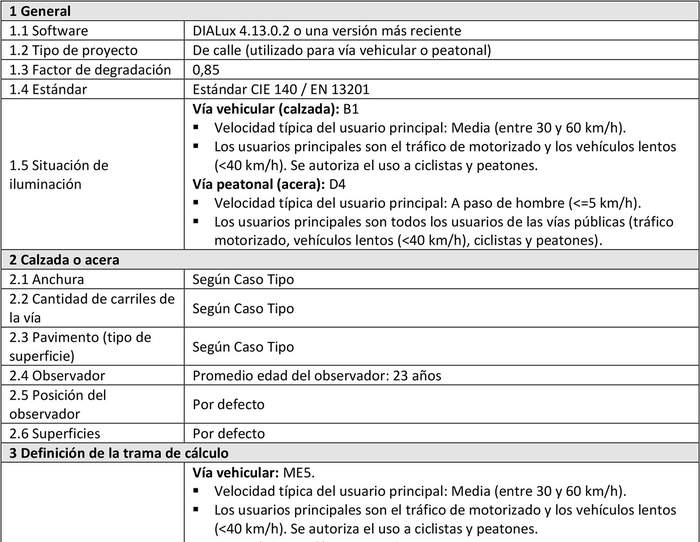 b) Caso Tipo: Conjunto de características representativas de vías de un Proyecto de alumbrado público que tienen una misma clase de alumbrado y características geométricas similares. Dichas características proporcionan la información mínima necesaria para realizar los cálculos de iluminación en dichas vías.
