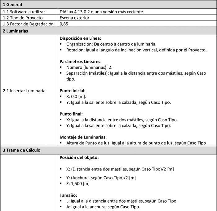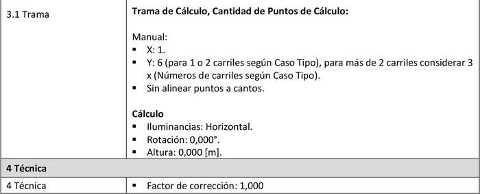En Proyectos de alumbrado público de vías vehiculares, para dar cumplimiento a lo indicado en el Artículo 18, letra b), del DS2, referido a las vías "sin separación entre usuarios", se deberá considerar la trama de cálculo que se describe a continuación.