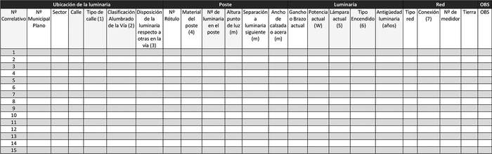 Nota: Se debe emplear una fila por luminaria, columnas adicionales es opcional, datos destacados en amarillo son obligatorios.