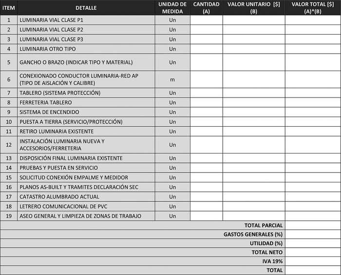 Nota: La tabla anterior podrá ser adecuada según los tipos de luminarias contempladas en el Proyecto y se podrán agregar más ítems si se considera necesario.