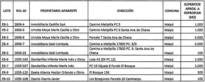 1. Apruébase el siguiente programa de expropiaciones para el año 2022, en la Región Metropolitana de Santiago, para la adquisición de los lotes ubicados en la comuna de Maipú a ser destinados a la ejecución del proyecto "Mejoramiento Integral Infraestructura Ferroviaria, Tramo Alameda Melipilla", Código BIP 40019826-0, según 9 Planos de Expropiación confeccionados por el Servicio de Vivienda y Urbanización Metropolitano, escala 1:400, 1:500, 1:600, 1:650, 1:700, 1:800, 1:850 y 1:950, confeccionados con fecha julio de 2021, según corresponda a cada uno de los lotes, cuyo objeto es el mejoramiento integral de la infraestructura ferroviaria entre Santiago y Melipilla, con el fin de implementar un servicio suburbano de pasajeros entre ambas ciudades, y que se singularizan a continuación: