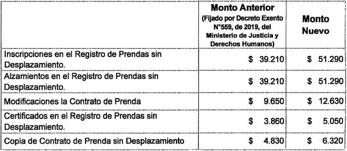 1° Reajústase el monto de las siguientes actuaciones relacionadas con el Registro de Prendas Sin Desplazamiento, que debe llevar el Servicio de Registro Civil e Identificación, fijándose sus nuevos valores en las cantidades que se indican a continuación: