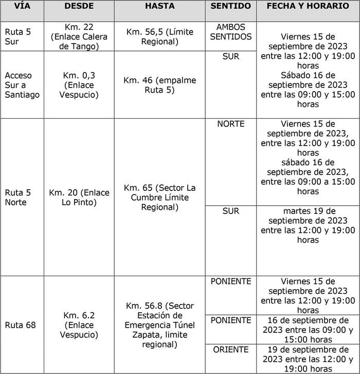 1.- Prohíbase, la circulación de vehículos de carga de dos y más ejes, en Ruta 5 Sur (tramo Santiago-Talca), Ruta 68, Interconexión Vial Santiago - Valparaíso - Viña del Mar y, Ruta 5 Norte (tramo Santiago - Los Vilos), los días 15, 16 y 19 de septiembre de 2023, en los tramos, sentidos de tránsito y horario que se indican en el siguiente cuadro: