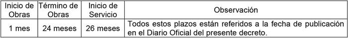 3. Los plazos para el inicio y término de obras e inicio de servicio, son los que se indican a continuación: