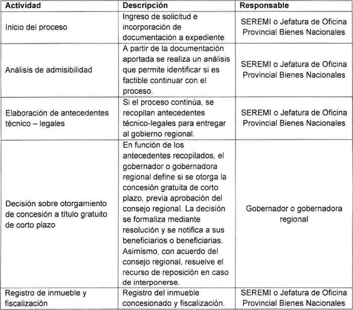 c) Las etapas o actividades que la administración ejecuta para el otorgamiento de las referidas concesiones se realizarán por el gobierno regional o la respectiva Seremi de acuerdo al siguiente detalle: