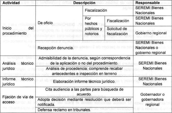 c) Las etapas o actividades que la administración ejecuta para la fijación de vías de acceso a playas de mar, ríos o lagos en terrenos colindantes se realizarán por el gobierno regional o la respectiva Seremi de acuerdo al siguiente detalle: