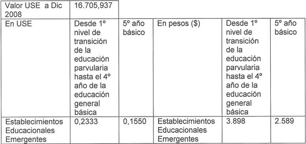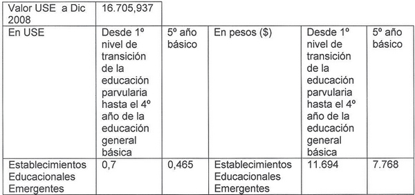 Artículo único: Fíjase para el año 2009 el monto en pesos del aporte adicional a que se refiere el artículo 20 de la ley Nº 20.248 y de las proporciones de dicho aporte que deban pagarse a los establecimientos educacionales emergentes que no cuenten con un plan de mejoramiento educativo aprobado por el Ministerio de Educación, de conformidad a lo establecido en las siguientes tablas: