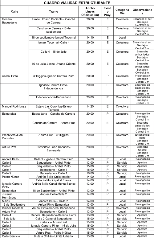 La vialidad estructurante graficada en el Plano PRCEC-01 y sus anchos entre líneas oficiales, están constituidas por las vías indicadas en el cuadro de este artículo. Las vías locales y de servicio, a diferencia de las de mayor jerarquía, están afectas a declaratoria de utilidad pública en los términos señalados en el artículo Nº 33 de la Ley Nº 18.695. (Ley Orgánica Constitucional de Municipalidades).