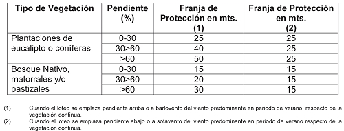 Los proyectos de loteo colindantes con áreas de vegetación continua deberán reservar una franja de ancho variable de acuerdo a la siguiente tabla, en la cual no se permitirán edificaciones:
