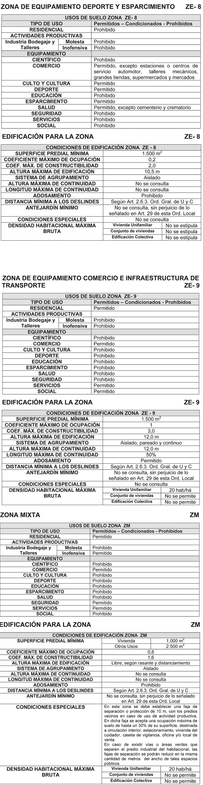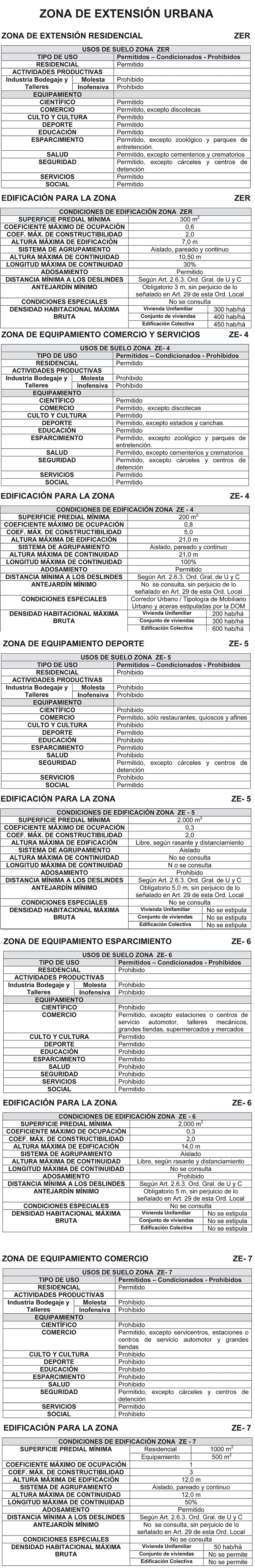 Estas macro-zonas se subdividen en las zonas graficadas en el Plano PRCEC-01, que se describen a continuación, atendiendo a las características de uso de suelo, normas urbanísticas de subdivisión, urbanización y construcción, que se determinan para cada una de ellas.