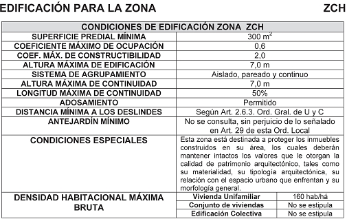 La declaración de Inmueble de Conservación Histórica se efectúa de conformidad a lo prescrito en el segundo inciso del Artículo 60 de la Ley General de Urbanismo y Construcciones y de acuerdo con esta norma, los permisos que se otorguen para estos inmuebles, sea para su rehabilitación, reconstrucción, demolición o modificación de cualquier índole, sólo podrán ser otorgadas por la Dirección de Obras Municipales con la autorización previa de la Secretaría Regional Ministerial de Vivienda y Urbanismo. Lo anterior, siempre que las condiciones urbanísticas y constructivas de excepción a aplicar en ellos sean las establecidas en la presente Ordenanza. En El Carmen, se define una zona de Conservación Histórica, denominada ZCH y se detallan sus condicionantes urbanísticas en el Artículo 34 de esta Ordenanza. La Zona de Conservación Histórica corresponde al espacio urbano y sus conformantes ubicado en calle Baquedano entre las calles 18 de Septiembre e Ismael Tocornal.