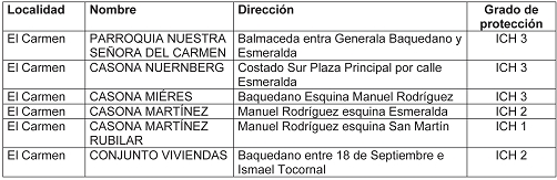 Los inmuebles de Conservación Histórica de la comuna de El Carmen son los siguientes: