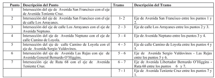 Conforme a lo dispuesto en el Artículo 2.1.10 de la Ordenanza General de Urbanismo y Construcciones, la descripción de los puntos y tramos del territorio comunal se indican en el Artículo 6 de la presente Ordenanza Local y se grafican en Planos: PRC - LP – 01 Zonificación Usos de Suelo y PRC - LP – 02 Infraestructura de Transporte.