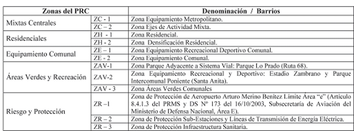 Artículo 27. Zonas del PRC. Para los efectos de la aplicación de la presente Ordenanza Local, se distinguen las siguientes Zonas: