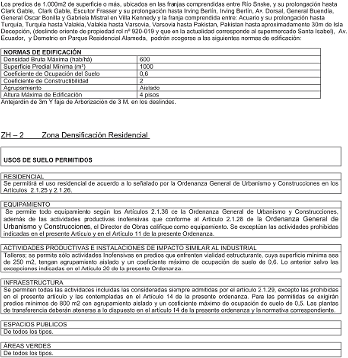 Las zonas indicadas en el Artículo 27 se aplicarán las normas relativas a usos de suelo, ocupación, subdivisión de predios y de edificación que se señalan a continuación, conforme a las disposiciones de los Artículos 2.1.25. al 2.1.36, y demás pertinentes de la Ordenanza General de Urbanismo y Construcciones.