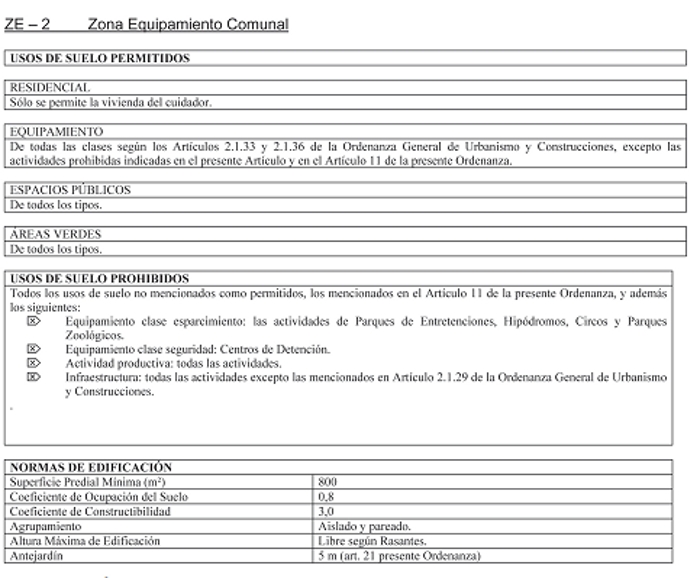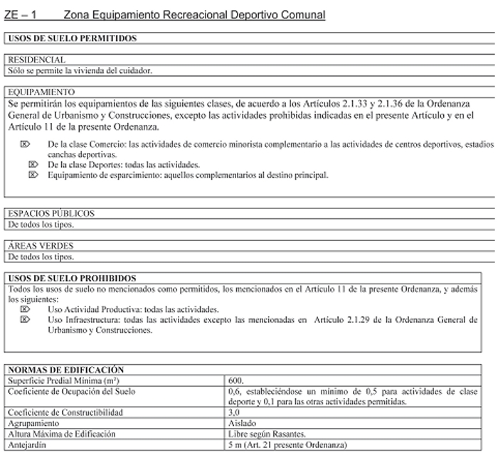 En zona ZE-1, Recreacional Deportivo Comunal y zona ZE-2 Equipamiento Comunal se exigirá antejardín de 5m.