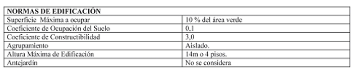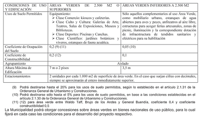 En esta área verde pública sólo se permitirá las instalaciones mínimas complementarias a su función, como actividades recreativas y de esparcimiento al aire libre, así como determinadas construcciones de edificios de uso público o con destinos complementarios al área verde en los términos dispuestos en el Artículo 2.1.30 de la Ordenanza General de Urbanismo y Construcciones. Asimismo, regirá lo dispuesto en el Artículo 16 de la presente Ordenanza Local.