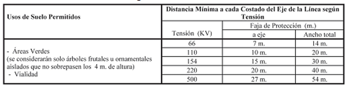 Para los efectos de la aplicación del presente Plan, se consideran las siguientes fajas de protección que se encuentran identificadas en el plano PRC - LP - 01 Zonificación y Usos de Suelo y cuyas dimensiones dependen de la tensión de la red medida en Kilovolt conforme a lo señalado en el siguiente cuadro: