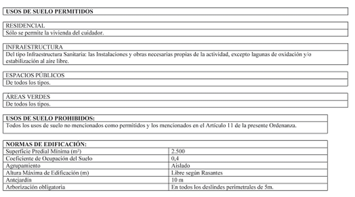 Se aplicará, para su regulación, lo dispuesto en los Artículos 2.1.30 y 2.1.31 de la Ordenanza General de Urbanismo y Construcciones, además de lo señalado en el Artículo 16 de la presente ordenanza local y lo dispuesto a continuación en relación a las condiciones de uso de suelo y edificación: