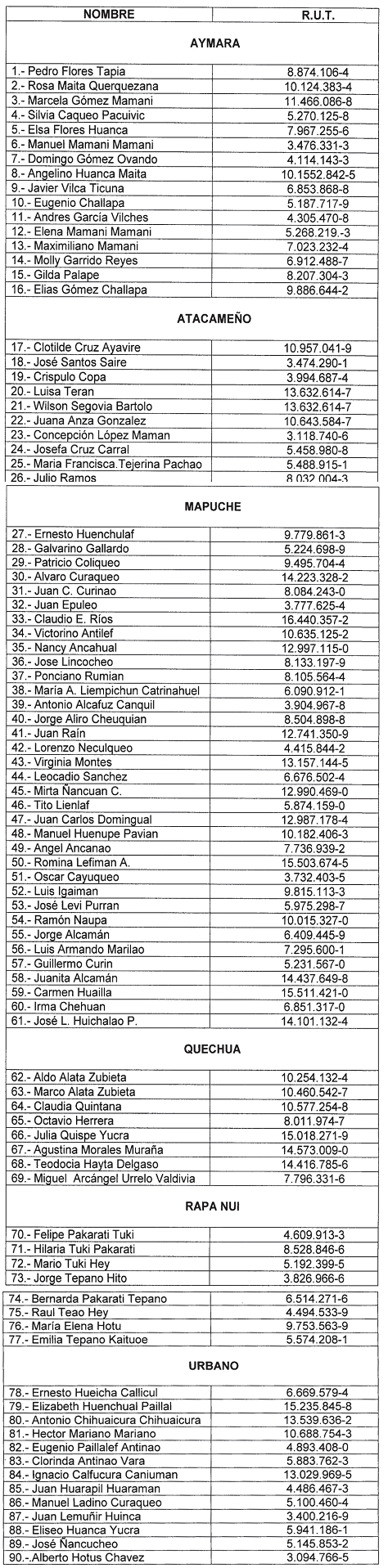Artículo único: Reconózcase la calidad de Formador de Educadores Tradicionales Indígenas o Sabios Formadores Indígenas en cada uno de los Pueblos Indígenas reconocidos por la ley N° 19.253, reconocimiento de carácter social y honorífico, a las personas que se indican: