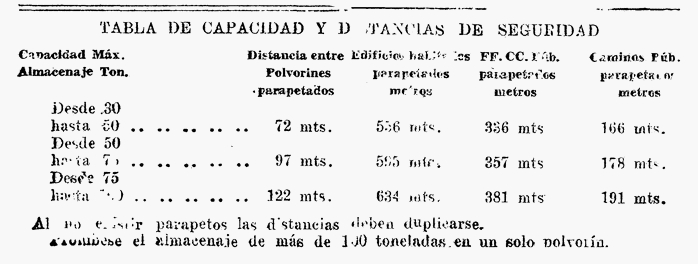 Los parapetos de los polvorines mismos consistirán en muros de circunvalación a unos 3 metros de distancia del edificio. La entrada no podrá estar frente a la puerta del polvorín. La altura de los parapetos será del alto de los muros del polvorín, siendo verticales en su parte interior y en la exterior; el ángulo podrá variar entre 23o y 60o de inclinación, según la consistencia de la tierra o material empleado.