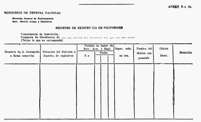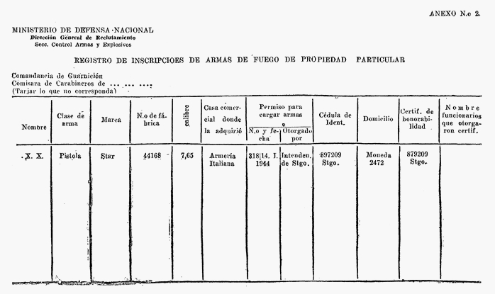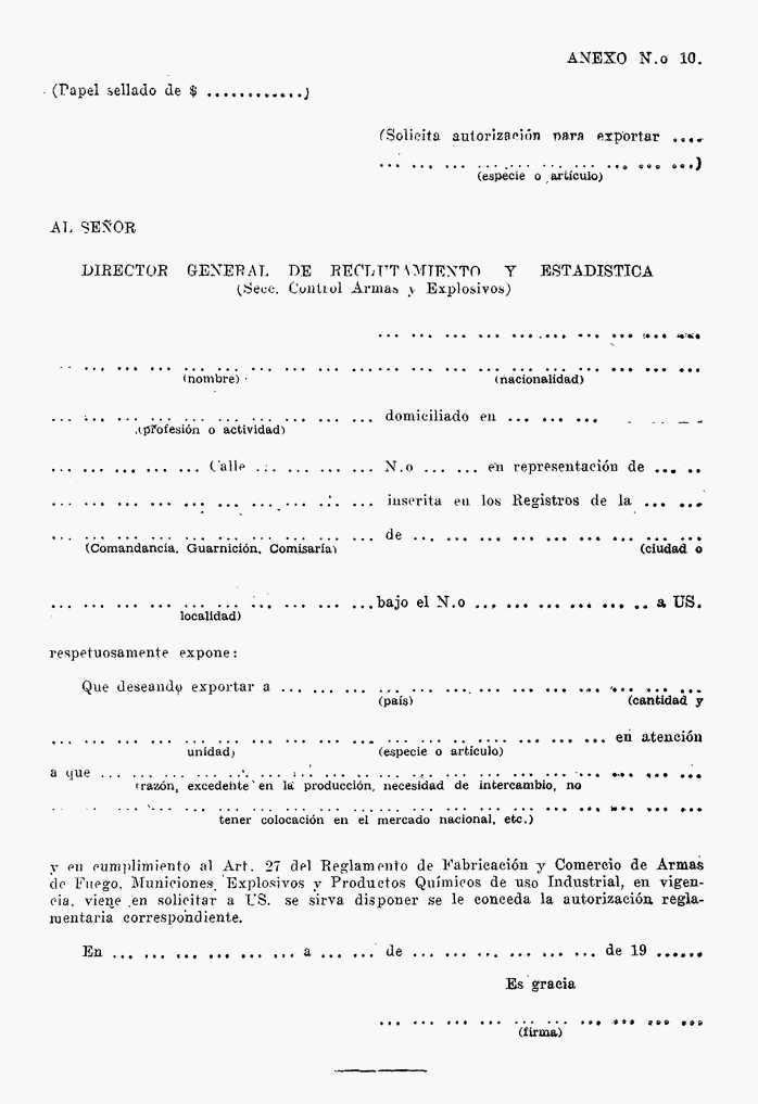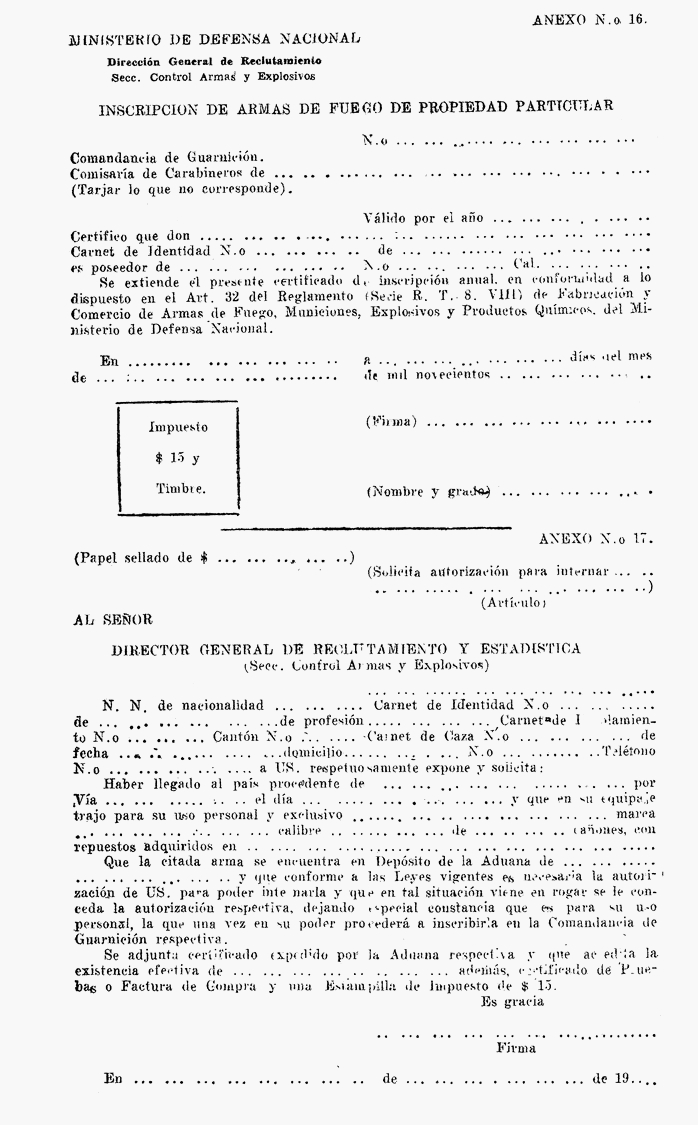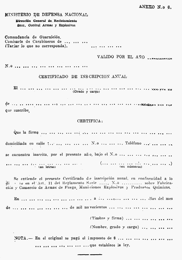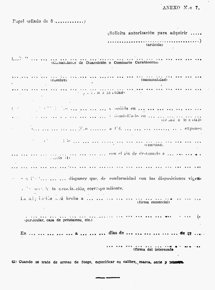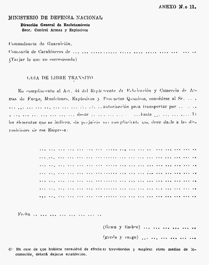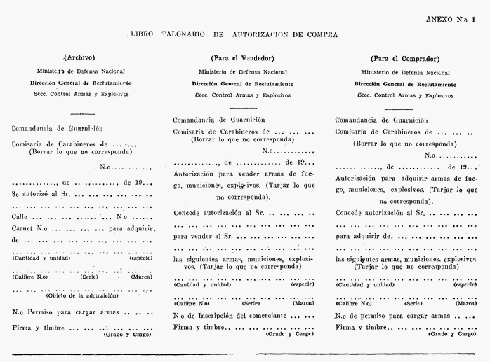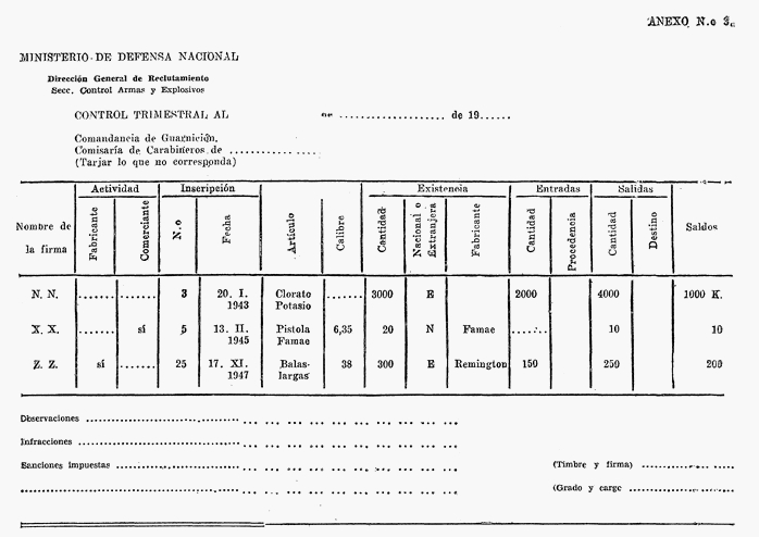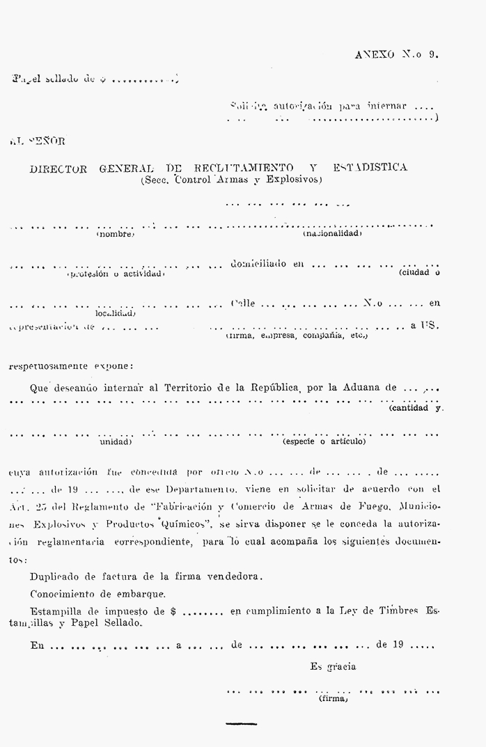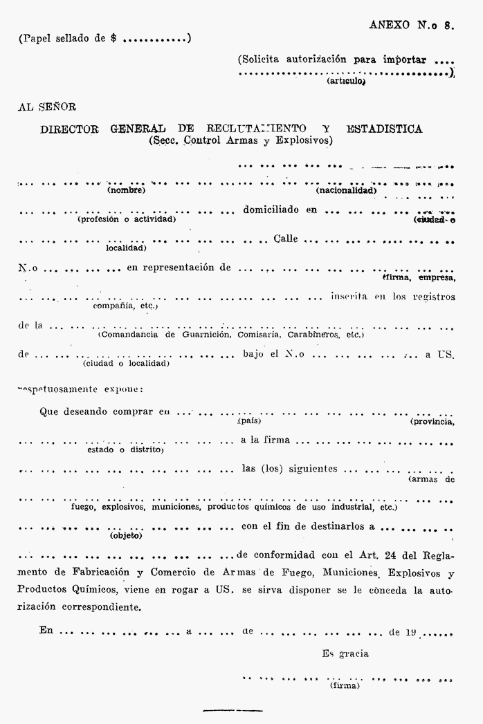 El Ministerio de Defensa Nacional, Dirección General de Reclutamiento y Estadística de las Fuerzas Armadas (Sección Control de Armas y Explosivos), otorga el presente permiso, sólo como organismo de control. Este documento no es en consecuencia, recomendatorio para que otros organismos del Estado concedan al solicitante los medios económicos correspondientes a su importación.