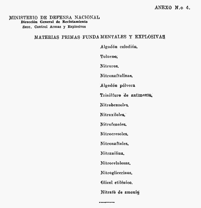 e) Las substancias químicas explosivas de cualquier carácter que sean, entendiéndose por tales todos aquellos cuerpos capaces de transformarse rápidamente en gas, con gran desprendimiento de calor y aumento de volumen, y de producir, como consecuencia, efectos mecánicos o pirotécnicos de consideración. Quedan incluidas aquellas substancias de uso industrial o farmacéutico, distinto al normal de los explosivos, como ser: piroxilina, colodión, ácido pícrico, nitrato de amonio, cloratos, percloratos y demás substancias que puedan tener efectos explosivos y deletéreos. Además, las materias primas fundamentales en la fabricación de explosivos, según relación que se agrega como anexo 4.