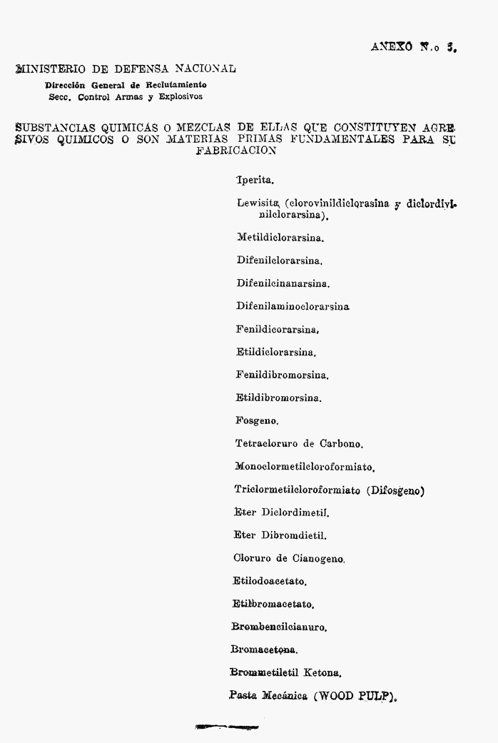 g) Las substancias químicas o mezclas de ellas, que constituyen agresivos químicos que sean materias primas fundamentales para su fabricación y cuya relación se agrega como Anexo 5, la que también será completada o reformada cuándo se estime conveniente.
