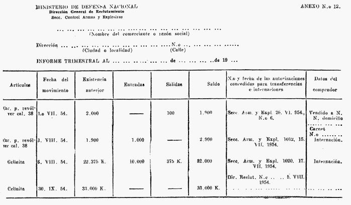 Los libros impresos y formularios serán, proporcionados por la Dirección General de Reclutamiento y Estadística de las Fuerzas Armadas (Sección Control de Armas y Explosivos).