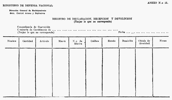 Las declaraciones, recepciones y devoluciones deberán ser comunicadas por relación detallada de acuerdo con el Anexo Nº 13 a la Dirección General de Reclutamiento y Estadística de las Fuerzas Armadas (Sección Control de Armas y Explosivos).