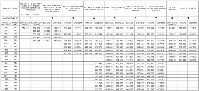 plantas por hectárea, entre las Macrozonas Nº 2 a