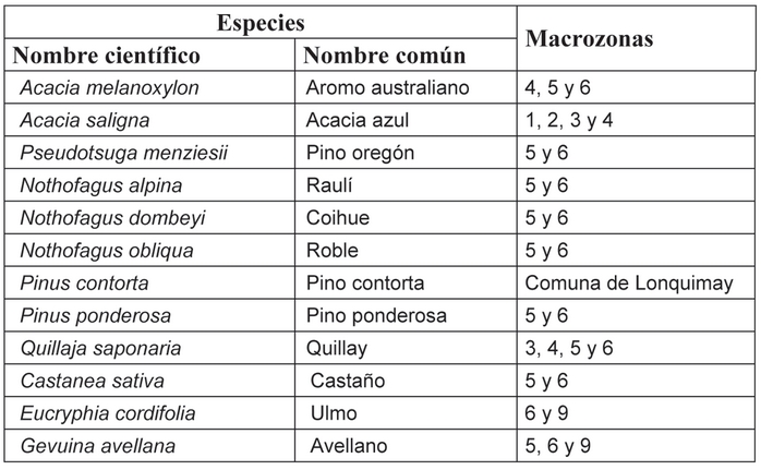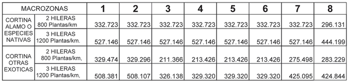 Para estos efectos sólo se bonificarán plantaciones con especies del género Eucaliptus y en las Macrozonas 5 y 6, aplicándose un costo único de $ 781.200 por hectárea, para una densidad mínima de 3.000 plantas/ha, en distanciamientos máximos de 3 metros entre líneas por 1,1 metros sobre la línea.