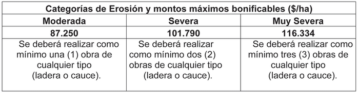 Para acceder a la bonificación por actividades de recuperación de suelos degradados, el beneficiario deberá acreditar la ejecución de las obras de recuperación de suelos en el área, las que se bonificarán por obra efectivamente construida, hasta el monto máximo que se señala a continuación en función del grado de erosión.
