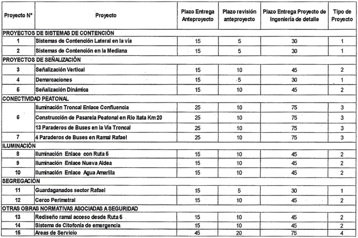 1. Modifícanse, por razones de interés público, las características de las obras y servicios del contrato de concesión de la obra pública fiscal denominada "Acceso Norte a Concepción", en el sentido que "Sociedad Concesionaria Autopista de Itata S.A." debió desarrollar los proyectos de Ingeniería de las obras indicadas a continuación, y en los plazos máximos que se fijan en el siguiente cuadro: