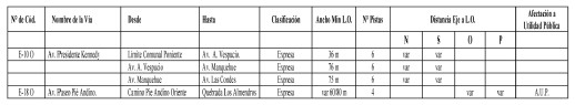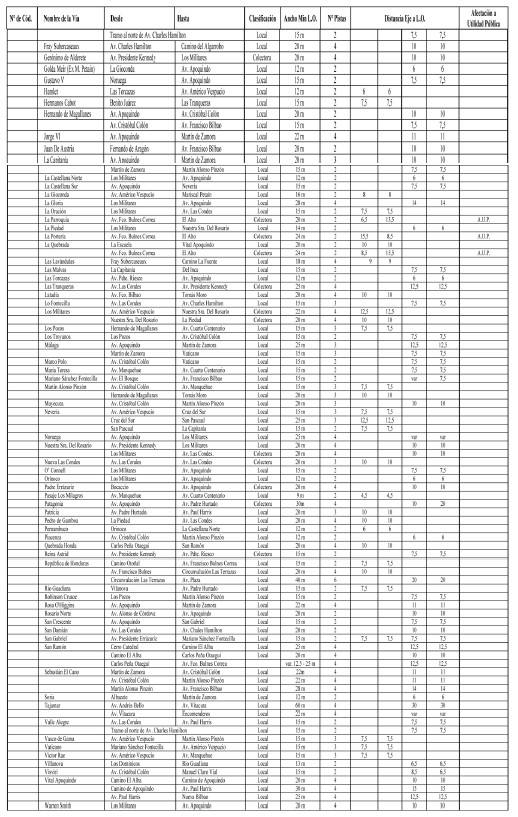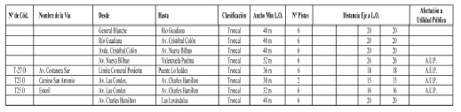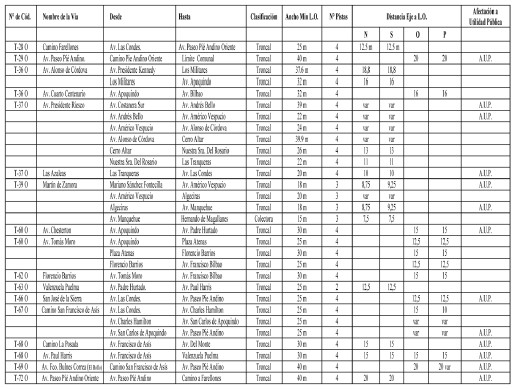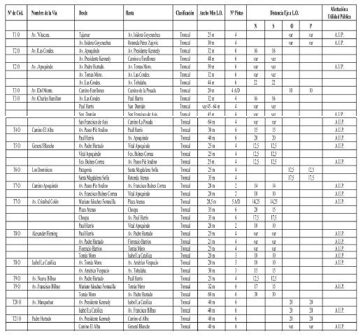 "Las vías expresas, troncales, colectoras, de servicio y locales, tanto existentes como proyectadas, graficadas en el Plano N° 3, Plano de Vialidad, tendrán los anchos y características que se señalan en los cuadros del presente artículo."