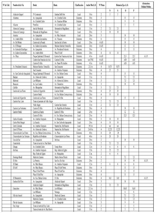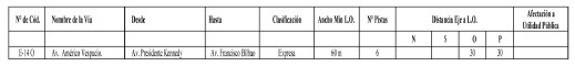 d) En todos los cuadros: elimínase las columnas correspondientes a "Bandejón" y a "E o P" y agrégase la columna "Afectación Utilidad Pública".